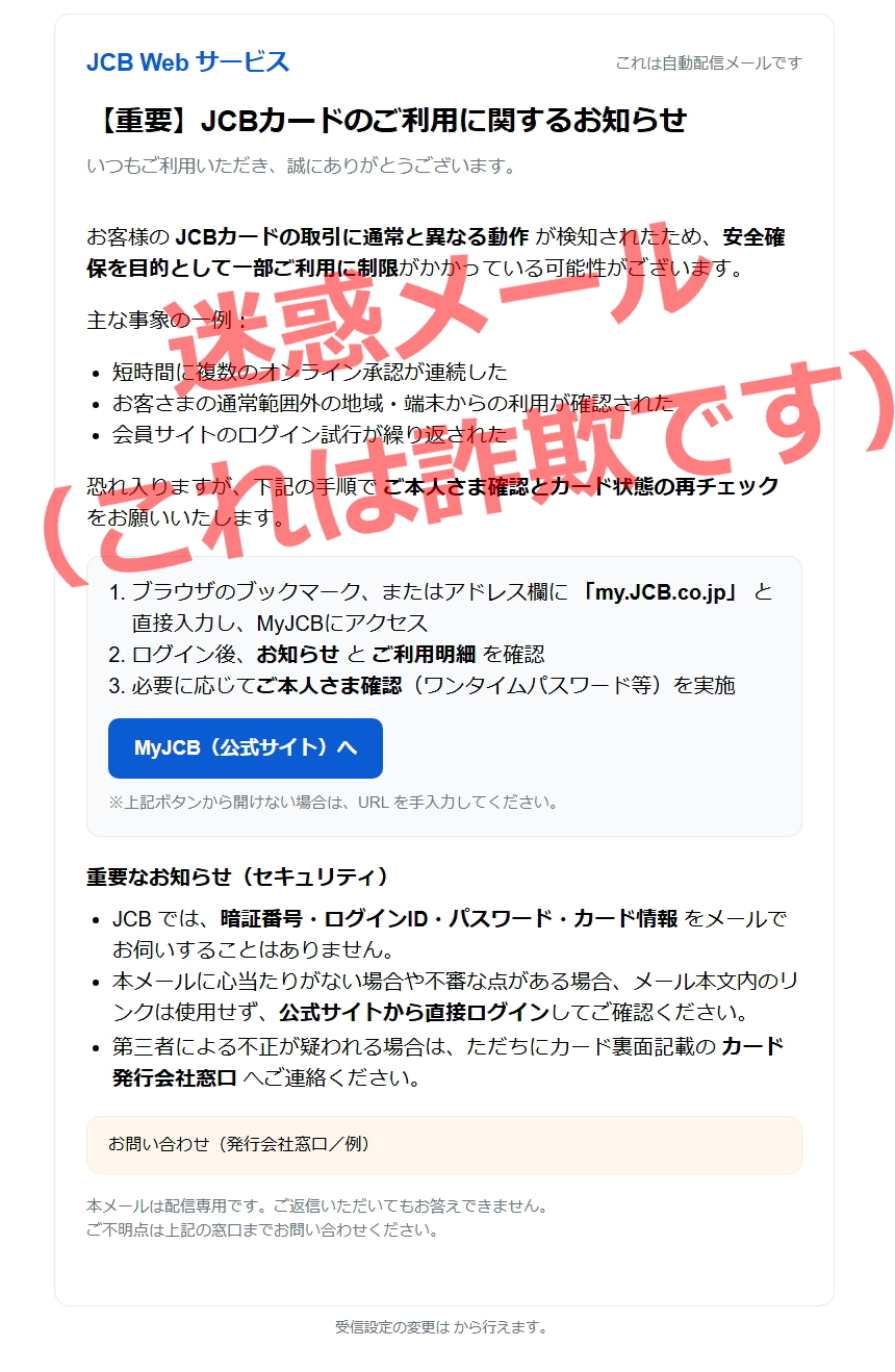 メール件名「Apple サポート」・「Apple ID」のほか、携帯電話会社・クレジットカード会社・ETCサービス・大手通販サイト・金融機関・証券会社などをかたる不審メールや偽サイトの詐欺が増加しております。これらに対して