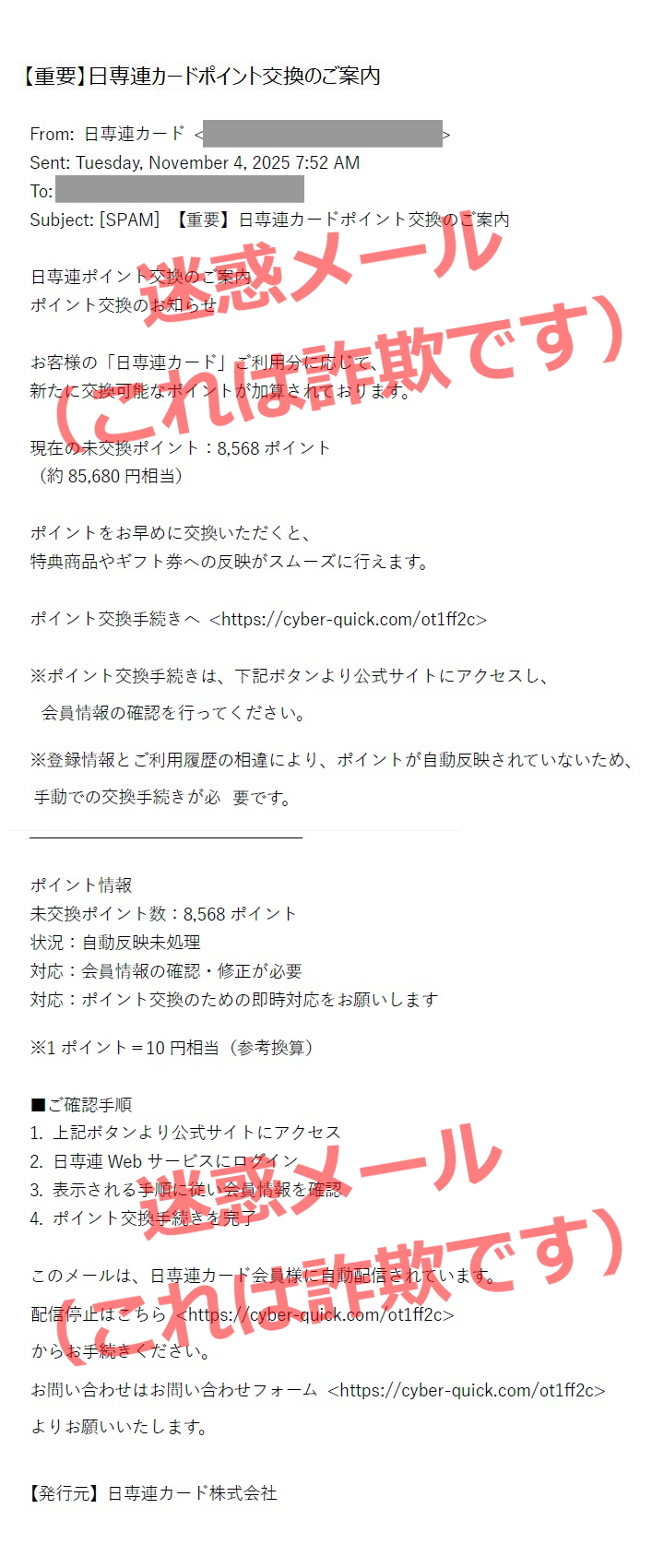 メール件名「【重要】日専連カードポイント交換のご案内」を確認しました。これらに対して